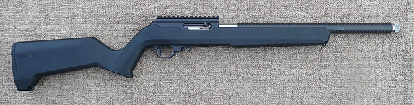 SY19650 .22LR Rimfire Magic semi-auto rifle with Feddersen 16″ heavy plain (not fluted) black barrel threaded 1/2 x 20 UNF, Ruger® BX® trigger unit with CST last shot hold open device, Power Custom extended bolt handle in a black Magpul X-22 stock …. £1,175