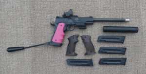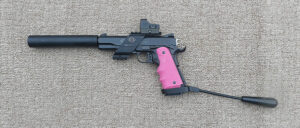 SY20006 GSG 1911 .22LR long barrel pistol. A complete and ready to shoot package consisting the pistol itself (previously owned by a young lady as the Hogue rubber grip panels grips might suggest!) plus several magazines, manual and basic tools. A pair of wood grips are included and the barrel comes with a carbon fibre shroud plus the original faux suppressor and the pistol topped off with a small red dot sight. The package comes in a rigid hard plastic case ….. £450